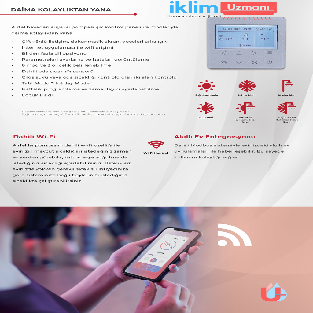 Uzaktan Erişim: Dahili Wi-Fi kontrol paneli sayesinde akıllı telefonunuzdan veya tabletinizden ısı pompanızı kontrol edebilirsiniz.